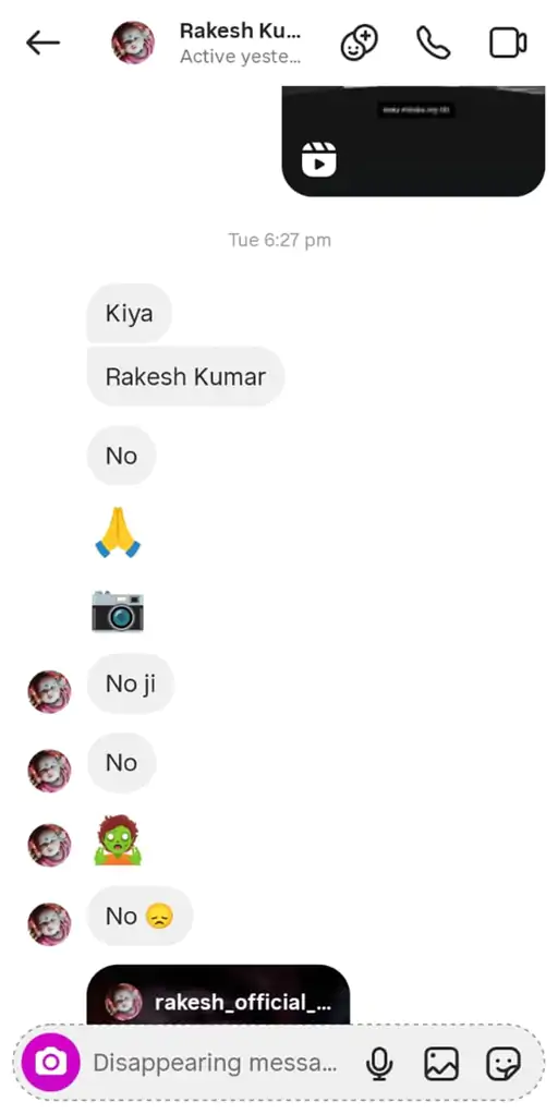 संजय का कहना है कि राकेश की इंस्टाग्राम आईडी से उसके पास इस प्रकार मैसेज आते रहे।