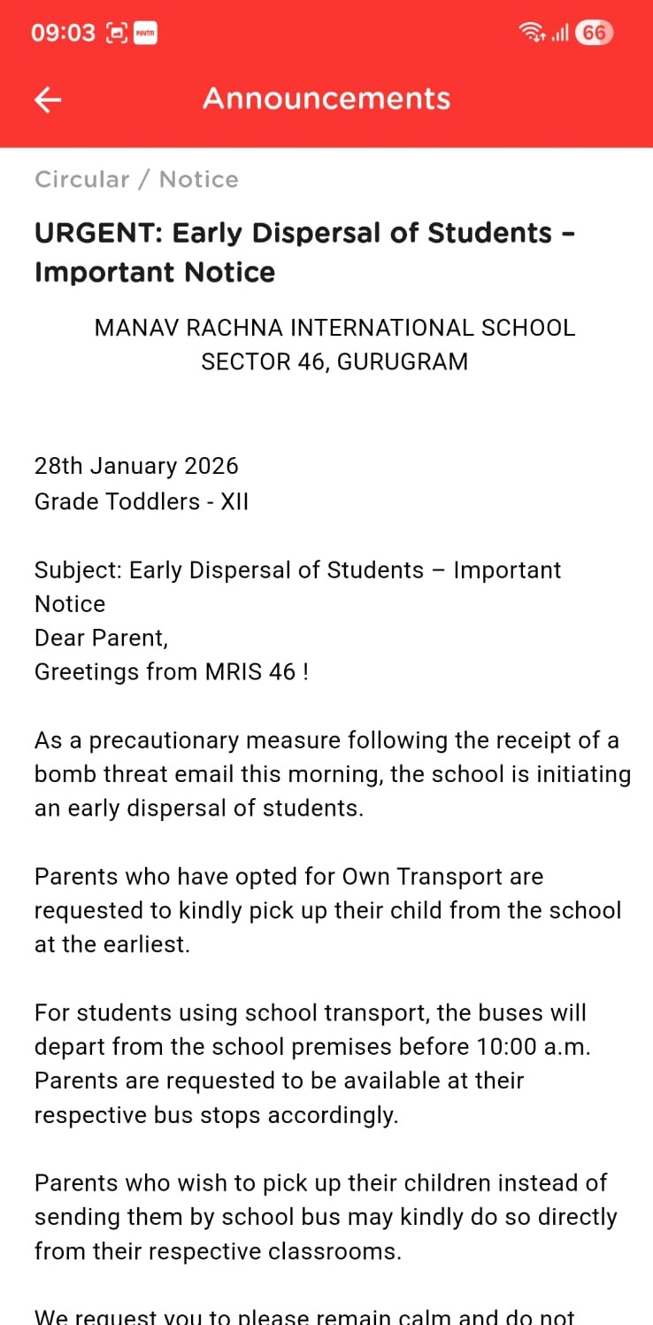 बसें बच्चों को लेकर स्कूल पहुंचने लगी थी। जिसके बाद स्कूल प्रबंधन की तरफ से पेरेंट्स को मैसेज भेजा गया कि वे अभी बच्चों को स्कूल न भेजें। जो बच्चे स्कूल में आ चुके हैं, उन्हें बाहर भेजा गया।