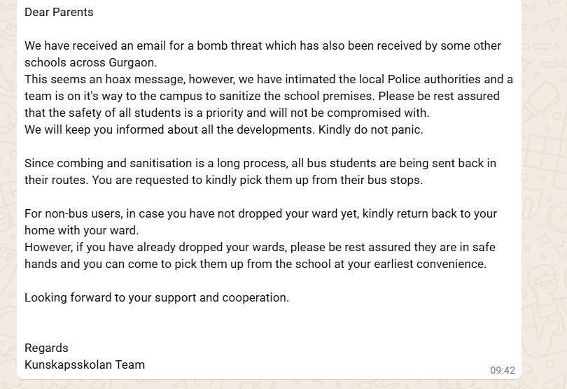 सभी स्कूलों के प्रबंधन की तरफ से बताया गया है कि सुबह के समय उन्हें ई मेल के माध्यम से धमकी मिली है। जिसके बाद उन्होंने पुलिस कंट्रोल रूम को सूचना दी। इस धमकी का पता उस समय चला जब बच्चों का स्कूल आने का समय हो गया था। पुलिस के अनुसार अलग-अलग स्कूलों के आधिकारिक ई-मेल आईडी पर धमकी भरे संदेश प्राप्त हुए, जिनमें स्कूल परिसरों में बम लगाए जाने का दावा किया गया था।