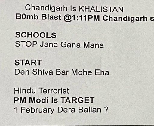 इस संबंध में स्कूलों को भेजी मेल में कहा गया है कि चंडीगढ़ खालिस्तान है। इसमें स्कूलों को धमकाया गया कि वह राष्ट्रगान जन गण मन की जगह पर देह शिवा वर मोहे इहे शुरू करें। इसके बाद PM मोदी को टारगेट करने की बात लिखी है।
