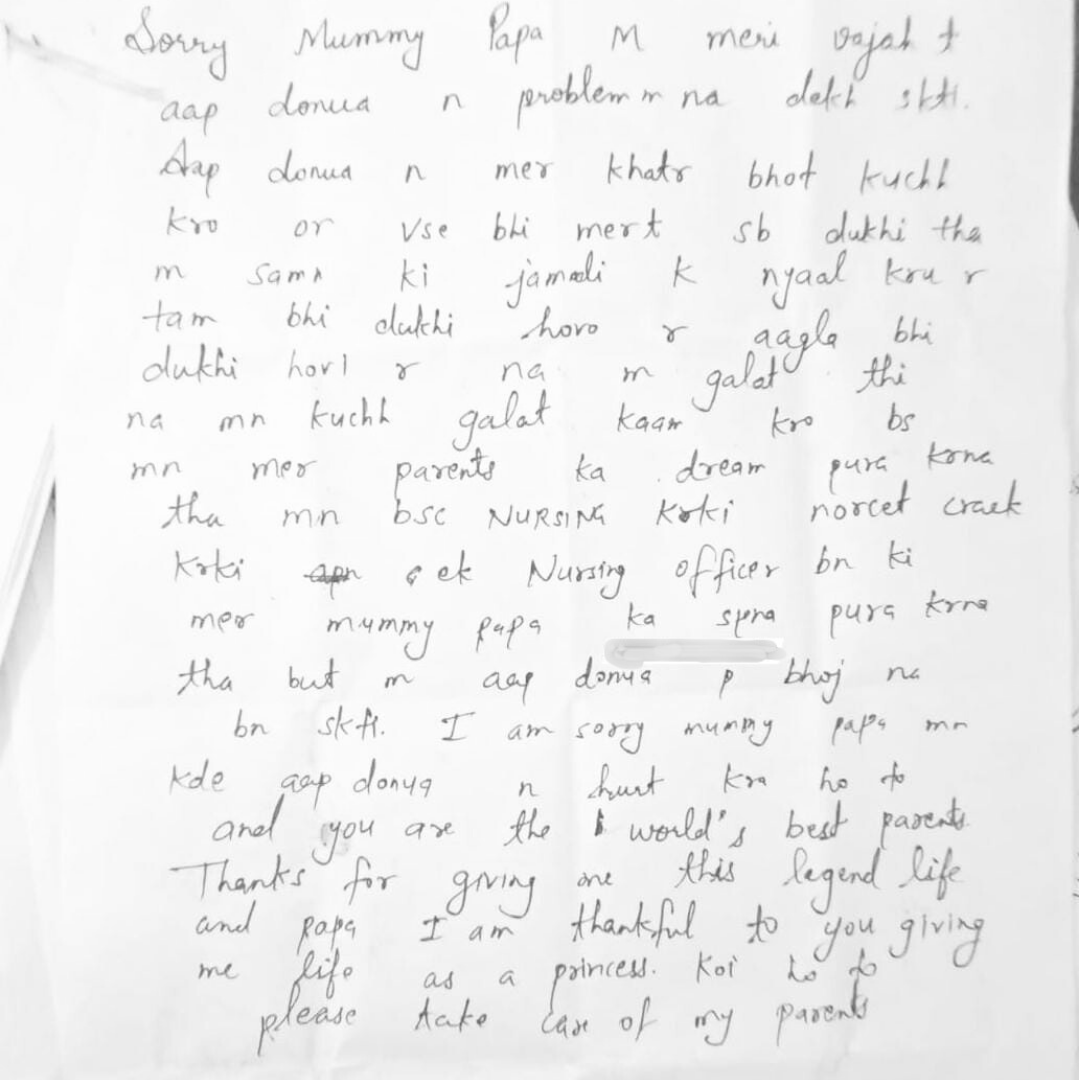 सॉरी मम्मी पापा मैं मेरी वजह से आप दोनों को प्रॉब्लम में नहीं देख सकती। आप दोनों ने मेरी खातिर बहुत कुछ किया और वैसे भी मेरे से सब दुखी थे। मैं सबकी बातें, जमाने की बातें, सोचती हूं और फिर भी दुखी हो रही हूँ। ना मैं गलत थी और ना मैंने कुछ गलत काम किया। बस मैं पेरेंट्स का ड्रीम पूरा करना चाहती थी। मैं BSc नर्सिंग कर रही थी क्योंकि NORCET क्रैक किया था और एक नर्सिंग ऑफिसर बनकर मम्मी पापा का सपना पूरा करना चाहती थी। लेकिन मैं आप दोनों पर बोझ नहीं बन सकती। आई एम सॉरी मम्मी पापा, मैंने कभी आप दोनों को हर्ट किया हो तो। और आप दुनिया के सबसे अच्छे माता-पिता हो। थैंक्यू, मुझे ये जिंदगी देने के लिए मम्मी और पापा। मैं आभारी हूं कि आपने मुझे एक राजकुमारी की तरह पाला। कोई हो तो प्लीज मेरे पेरेंट्स का ख्याल रखना।