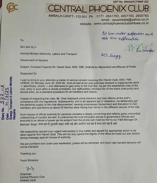 अंबाला | Sahil Kasoon The airnews : हरियाणा में बिजली निगम के एक्सईएन (XEN) हरीश गोयल को राज्यमंत्री अनिल विज द्वारा सस्पेंड करने का मामला सामने आया है। आरोप है कि गोयल सोमवार रात अंबाला के फीनिक्स क्लब में लोअर-टीशर्ट और चप्पल पहनकर पहुंचे। क्लब स्टाफ ने ड्रेस कोड का हवाला देकर उन्हें रोका, जिसके बाद कथित रूप से उन्होंने क्लब का बिजली कनेक्शन ही कटवा दिया।