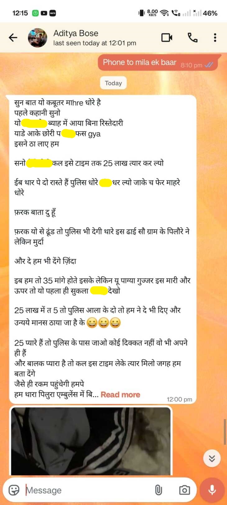 सोमपाल ने बताया कि आदित्य के ही मोबाइल नंबर से मेरे पास एक मैसेज आया। इसमें आदित्य के बिना रिश्तेदारी में किसी शादी समारोह में शामिल होने की बात बताई गई। किसी लड़की के साथ गलत होने का भी आरोप लगाया गया। मैसेज में लिखा था- तुम्हारे पास दो रास्ते हैं या तो पुलिस के पास चले जाओ या फिर हमारे पास आ जाओ। दोनों में फर्क इतना है कि पुलिस तुम्हारे लड़के को ढूंढ लेगी, लेकिन आदित्य मुर्दा मिलेगा। अगर, हमें फिरौती दोगे तो हम उसे जिंदा दे देंगे। हमें 25 लख रुपए दे दो, 5 लाख पुलिस वालों को भी दिए गए हैं। बगैर रिश्वत के यूं कोई भी आदमी नहीं उठाया जा सकता।