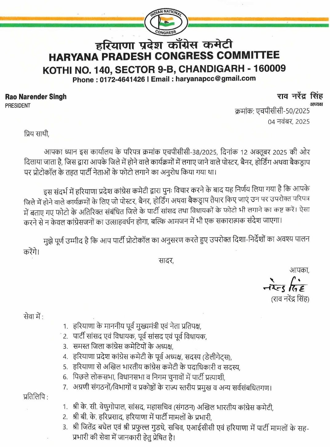 पद संभालते ही 10 नेताओं के फोटो का आदेश दिया था हरियाणा कांग्रेस गुटबाजी से बचने को नए-नए पैंतरे आजमा रही है, मगर गुटबाजी कम होने का नाम नहीं ले रही। राव नरेंद्र के नए प्रदेशाध्यक्ष के रूप में पदभार संभालने के बाद कांग्रेस ने 12 अक्टूबर 2025 आदेश जारी कर कहा था कि हरियाणा कांग्रेस के किसी भी प्रचार सामग्री में केवल 10 नेताओं की ही तस्वीरें होंगी।