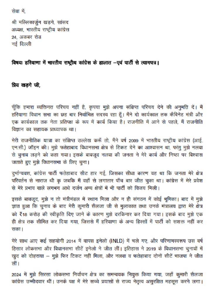 मैं एक गर्वित हरियाणवी हूं, और अपने प्रदेश की जनता को निराश नहीं कर सकता। हरियाणा के प्रति मेरी प्रतिबद्धता अटूट है – परंतु वर्तमान कांग्रेस नेतृत्व में मेरा विश्वास समाप्त हो गया है। अतः, मैं भारतीय राष्ट्रीय कांग्रेस से अपना त्यागपत्र देने के लिए विवश हूं।