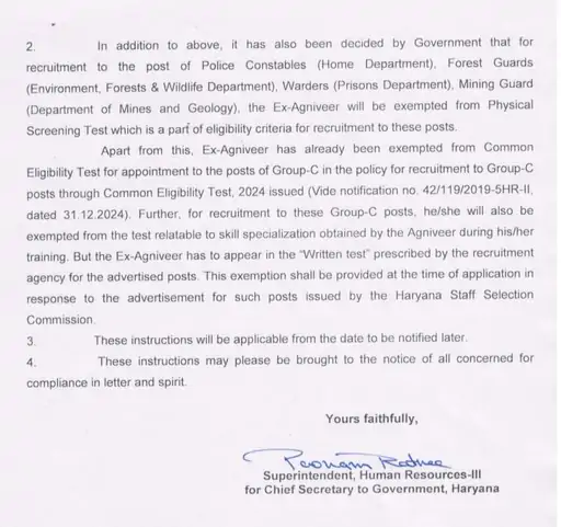 पुलिस कॉन्स्टेबल, वन रक्षक, वार्डर और खनन रक्षक पदों पर भर्ती के लिए पूर्व अग्निवीरों को फिजिकल टेस्ट से छूट मिलेगी।