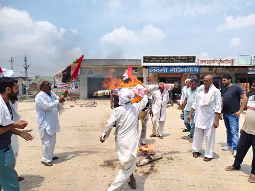 हिसार में किसानों का सरकार के खिलाफ प्रदर्शन: कैमरी गांव में सीएम नायब सैनी का पुतला फूंका, खाद-पानी व फसलों के उचित मूल्य की मांग