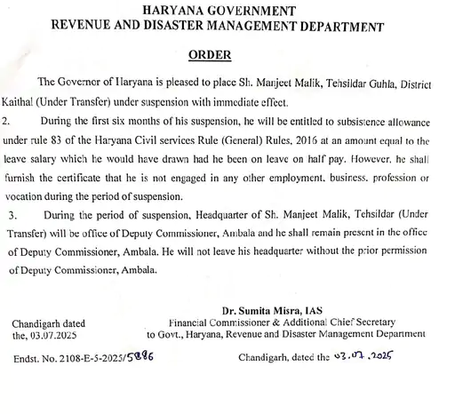 July 3, 202525 Views 3 min read हरियाणा में रिश्वतखोर तहसीलदार मंजीत मलिक सस्पेंड: 4 महीने से फरार, ACB ने घोषित किया था इनामी
